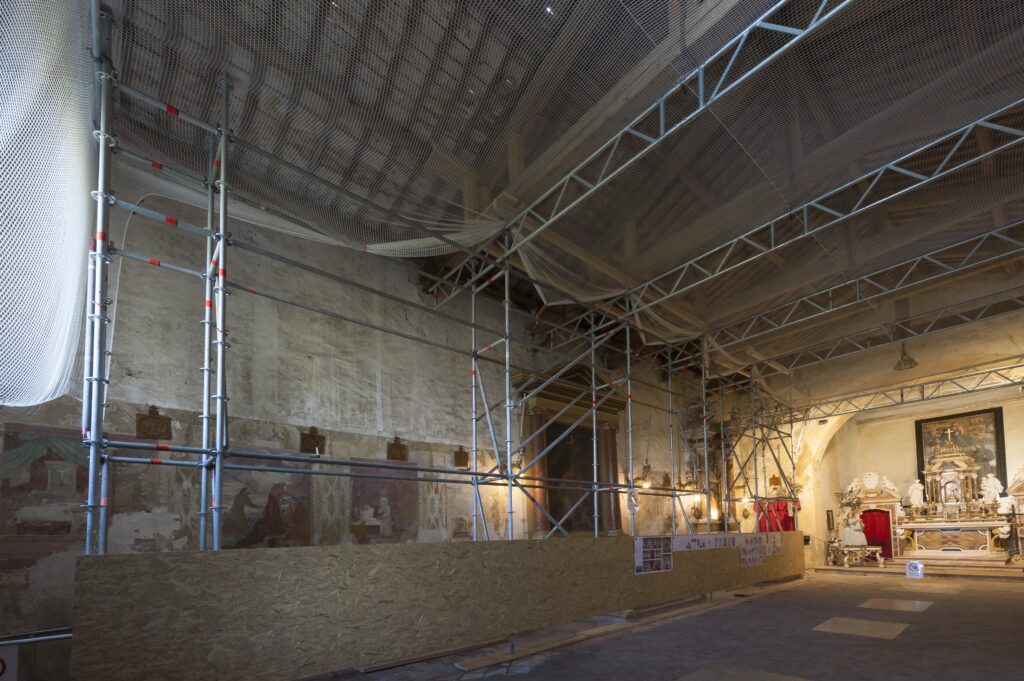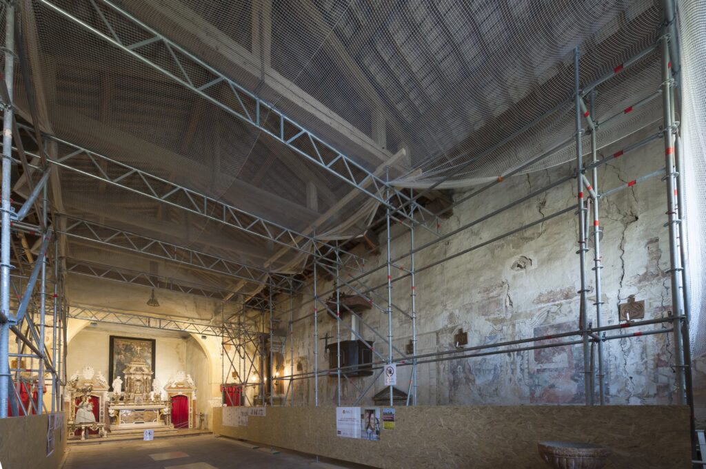 Nel corso del 2018 , confortata anche dalle moltissime adesioni alla campagna “I luoghi del cuore”, la proprietà’ ha deciso, nell’attesa delle condizioni per dar corso al restauro complessivo, di procedere con lo studio di un progetto più modesto ed immediato, per mettere in sicurezza la struttura della chiesa e poter rendere, pur con le dovute e necessarie limitazioni, il luogo di nuovo accessibile al pubblico. L’intervento di messa in sicurezza è consistito nel predisporre apposite strutture metalliche a supporto statico delle capriate del tetto e di una adeguata protezione contro l’eventuale caduta di calcinacci, ottenuta mediante una rete opportunamente assicurata a dette strutture metalliche e soprastante l’intera parte agibile della chiesa. Sarà inoltre eseguito un intervento di riparazione relativo alle tegole del tetto per eliminare le infiltrazioni di acqua piovana.